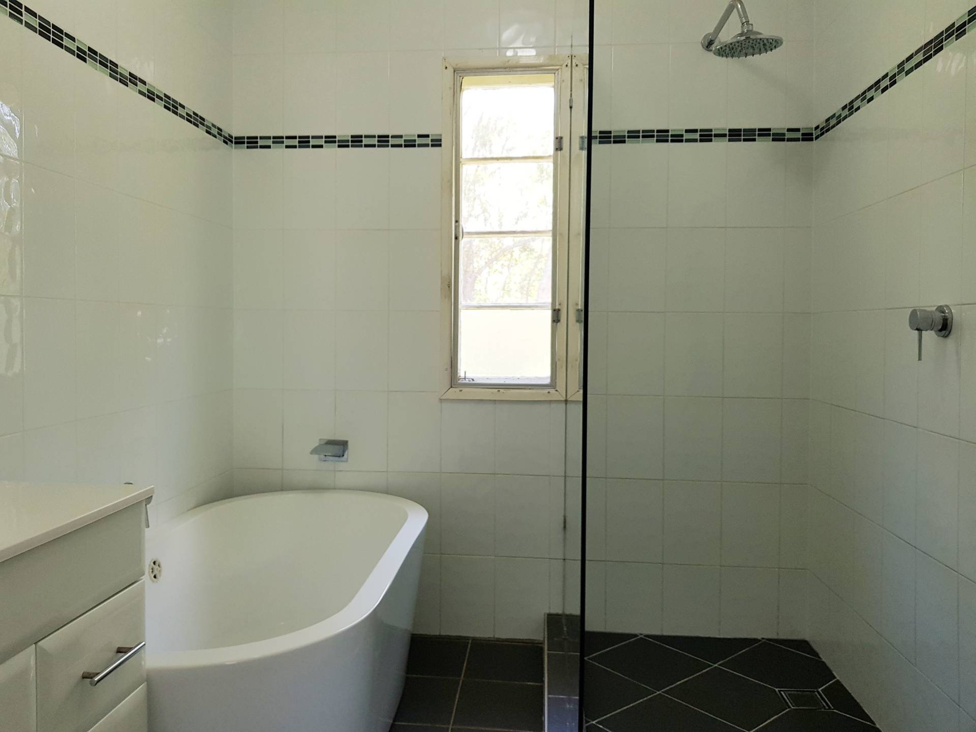 * Updated bathroom has walk-in shower, tiled with separate bath tub & separate toilet off the study area, tank water & septic system in place